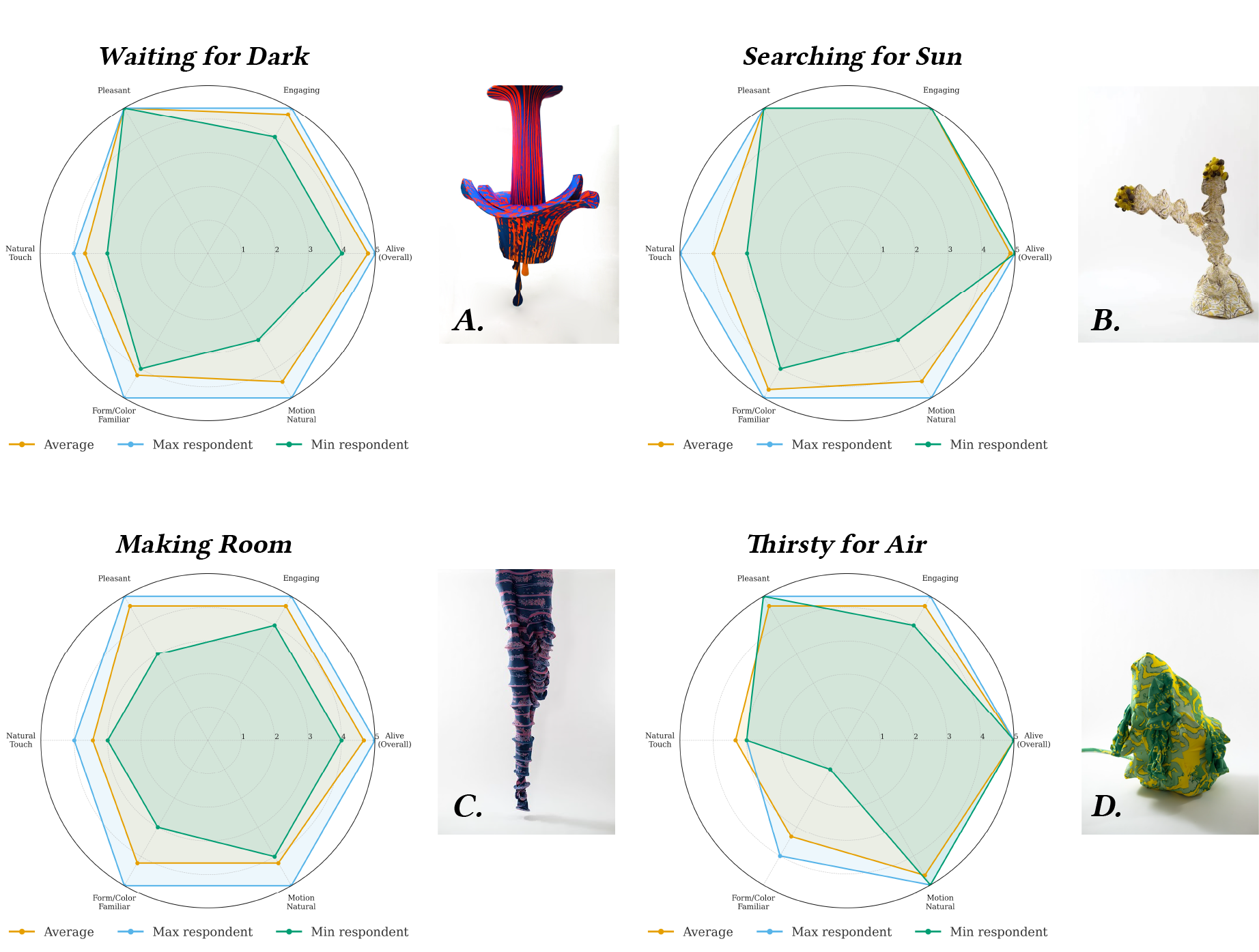 Preliminary data from the physical installation show participants found the experience pleasant, natural, and alive, evoking calmness and curiosity. Future stages will include the virtual-twin dataset and integrate biometric sensing (heart rate, skin conductance, pupil dilation) to deepen understanding of emotional resonance across modalities.