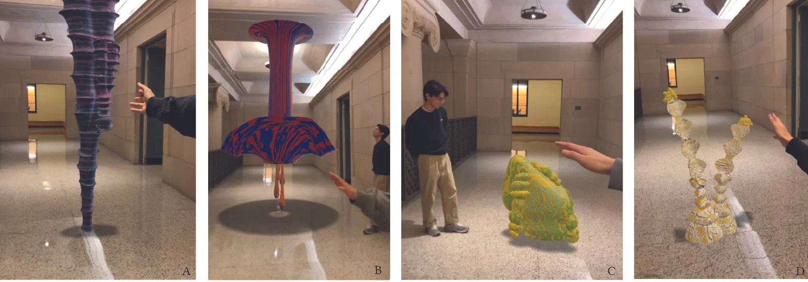 Each robot employs unique actuation systems (motors, spools, pneumatic chambers, or servos) controlled via microcontrollers and randomized timing, generating lifelike unpredictability. The AR twins are animated using recorded motion data, reproducing the same temporal signatures within a spatially aligned immersive environment.
