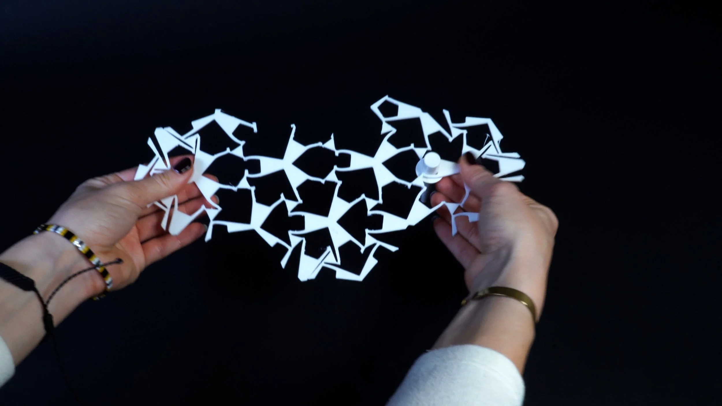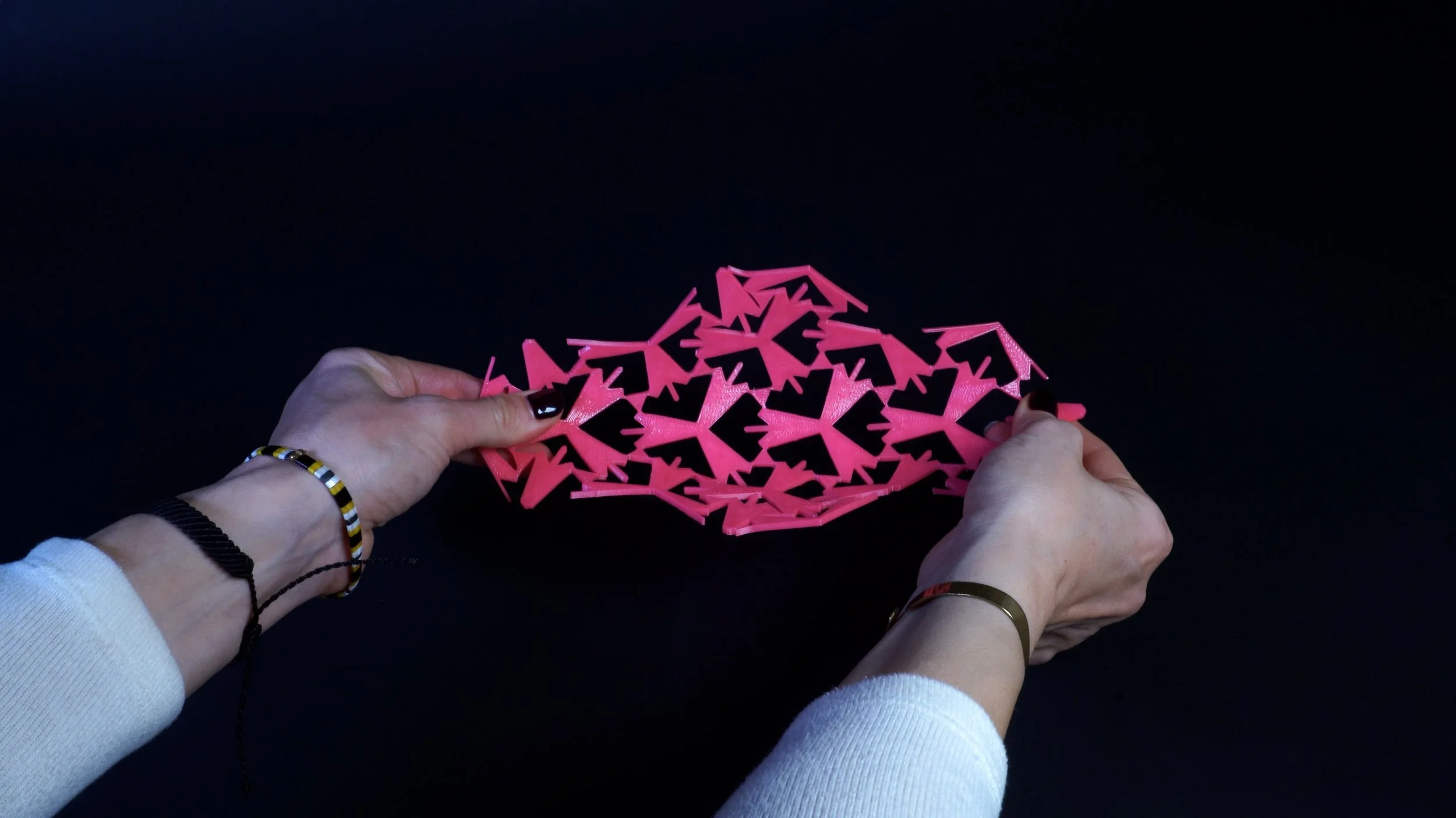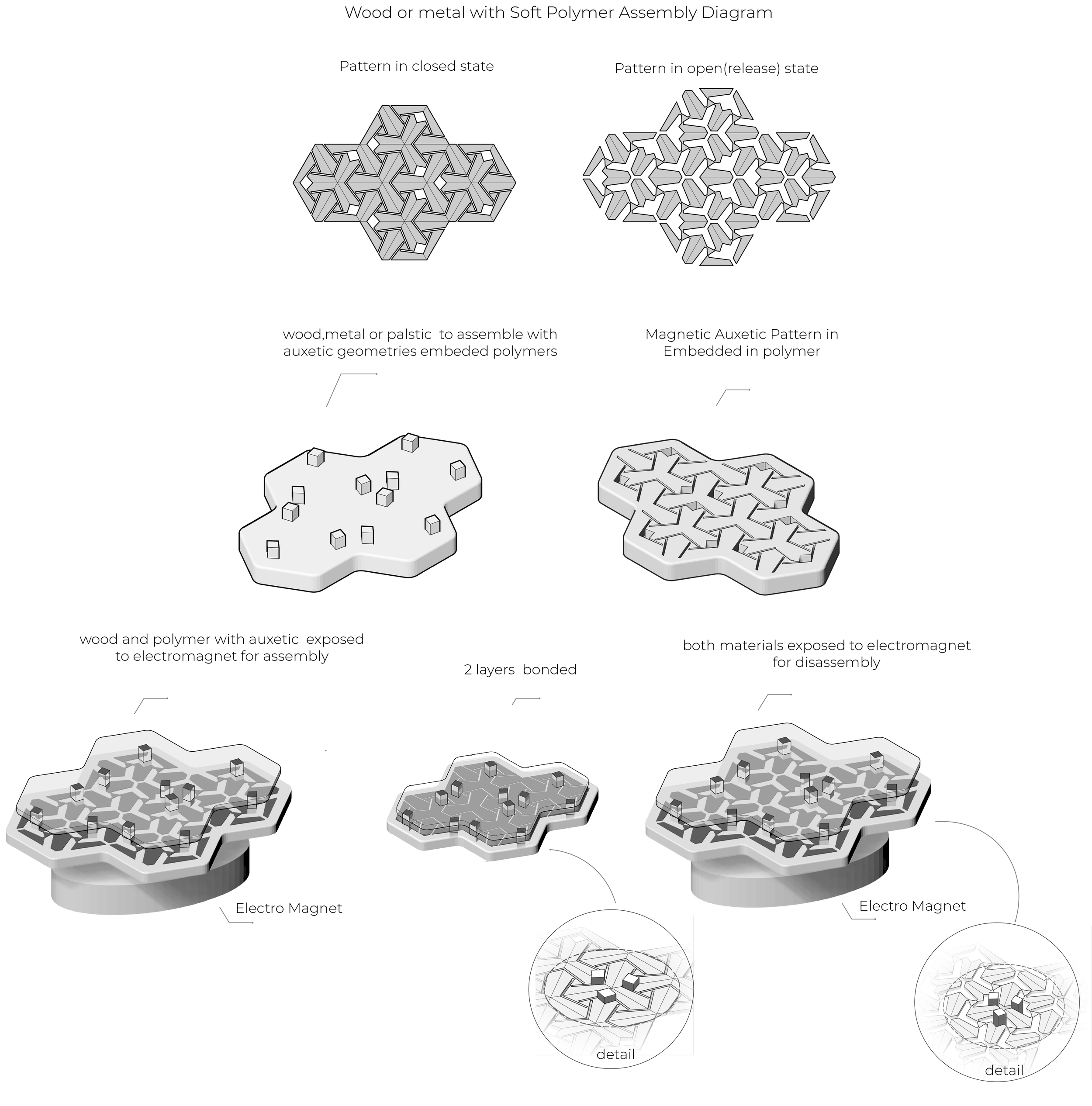 One line of inquiry explores mechanical disassembly, using magnetic particles and auxetic geometries and bimaterial prints to create joints that can detach under specific magnetic fields or forces. In parallel, I am developing disassembly methods for soft materials, such as fabrics and threads, including dissolvable threads that release upon exposure to targeted solvents, as well as new threading methods. By combining these approaches, I aim to establish a spectrum of mechanisms that enable products to be easily deconstructed at the end of their lifecycle without losing constituent materials. This work advances a circular design framework where materials are programmed to unmake themselves under defined conditions, offering a response to the limitations of today’s recycling systems.
